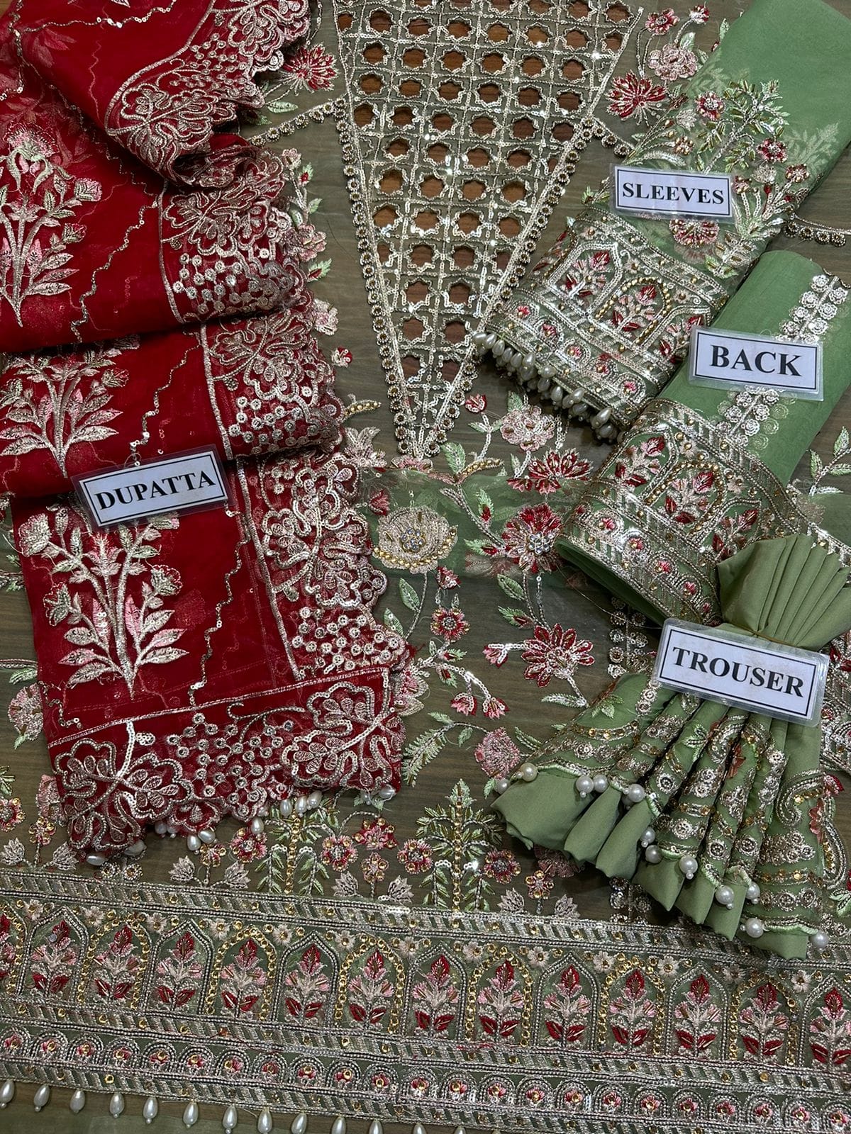 - Front: Heavy Embroidered with Multi-Colors Thread, Sequence, Zari, and Heavy Handwork